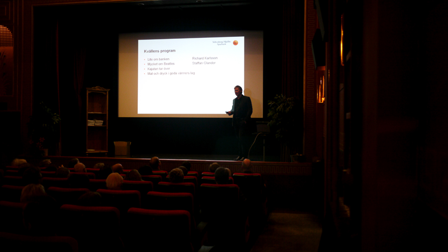 Biosalongen kan användas som föreläsningslokal, föreläsaren kan visa sitt föredrag på filmduken med en laptop som är kopplad till en bildkanon i maskinrummet, bredbandsuppkoppling finns också. Vi kan fixa fika.